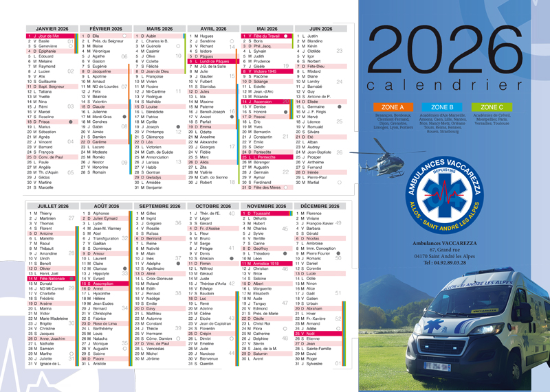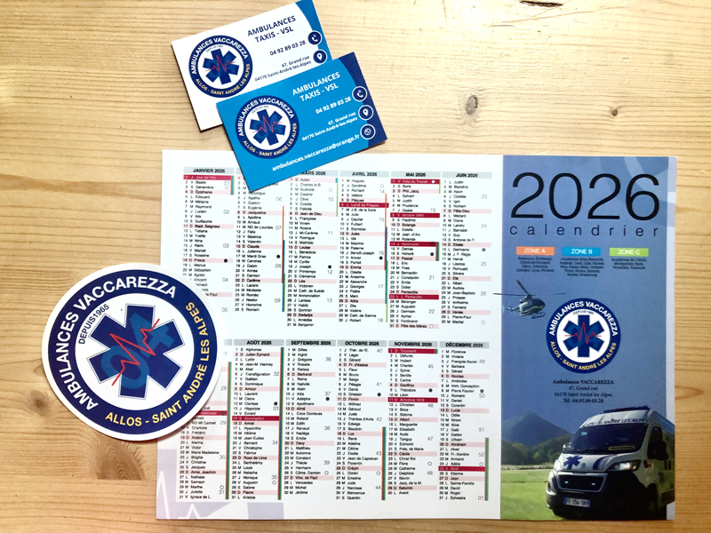Création de la charte graphique et logo de la société Ambulances Vaccarezza, et déclinaisons sur divers supports de com : Calendriers muraux, stickers, en-tête de lettre et en-tête html signature mail, roll-up, carte de visite.